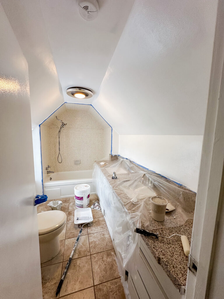 In total, I spent about a little more than $500. I already had some of the supplies on hand like paint, brushes, rollers, and drop cloths. The biggest expense (and the most difficult part) was painting the bathtub and surrounding tile. I ended up needing three Rust-Oleum Tub and Tile kits to cover the tub and old tile and they were about $45 each.