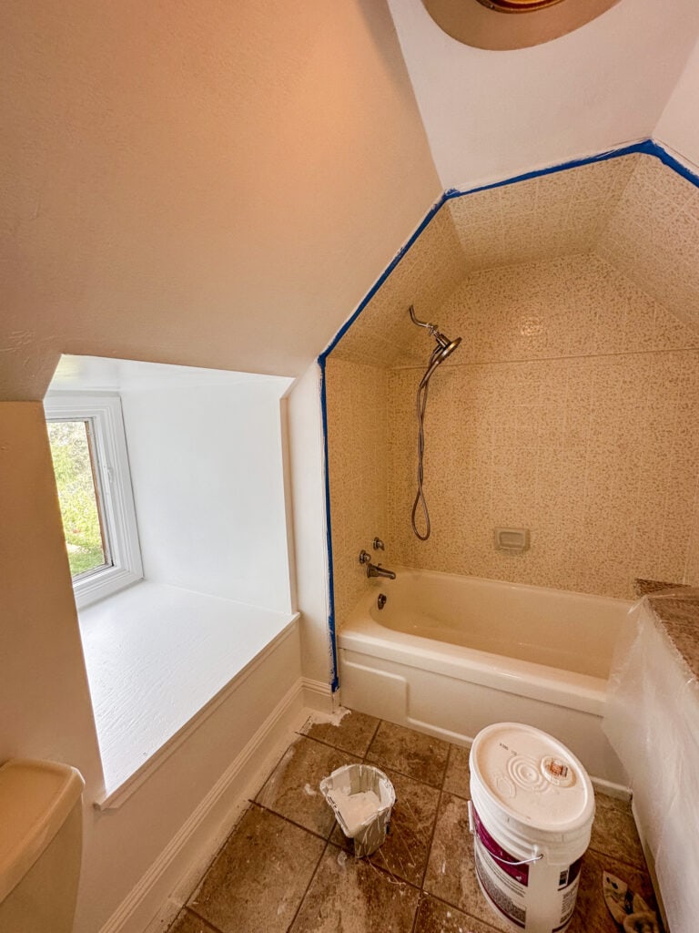 Painting the tub and shower tile was the absolute worst part of this makeover. I used Rust’Oleum Tub and Tile Kit to paint the tub and the surrounding tile. And this stuff smells bad.