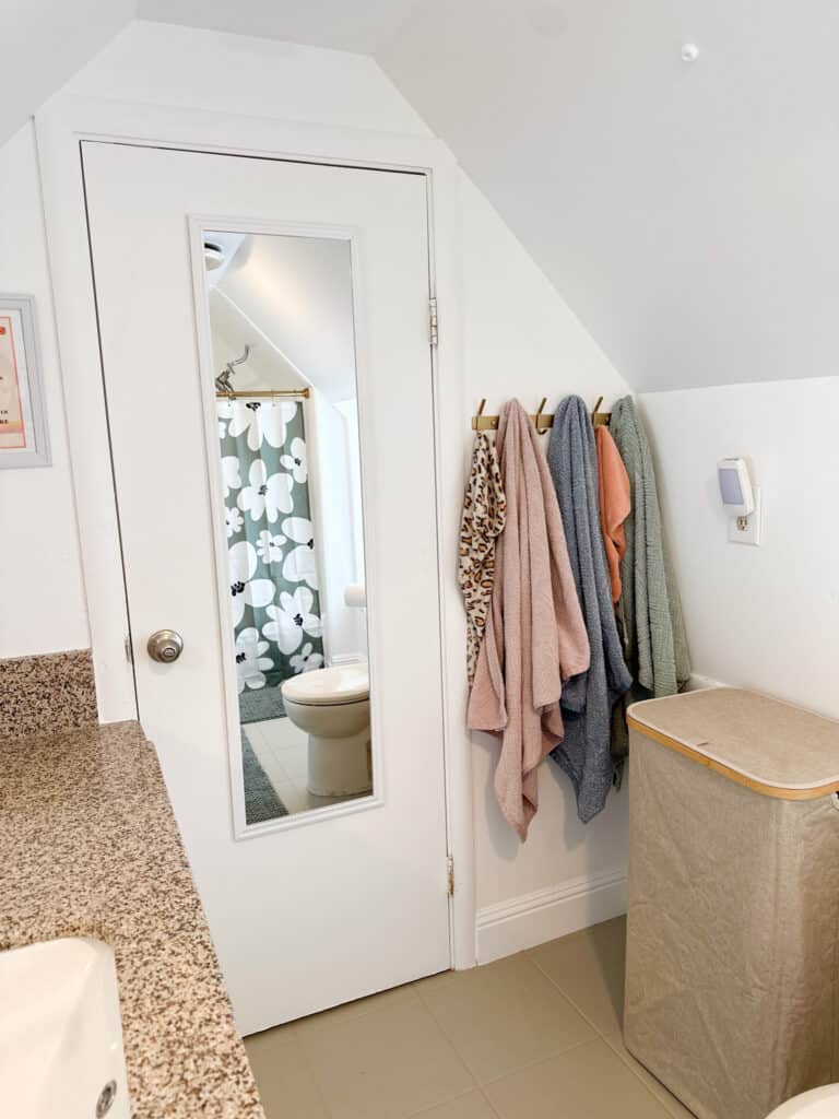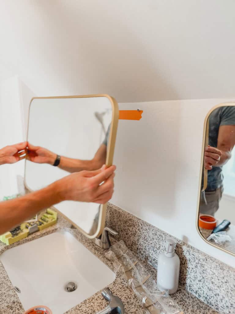 The fun part! After all the cleaning, sanding, repairing, and painting it was finally time to hang the hardware and decor! Starting with the mirrors! The space on the flat wall above the sinks is only 17 inches, so I had to find mirrors less than 16 inches wide. The old mirror was a builder-grade, frameless sort that ran the length of the wall leaving no room for a hand towel rack. These two 16 x 24-inch mirrors worked perfectly and I am really happy with how they turned out.