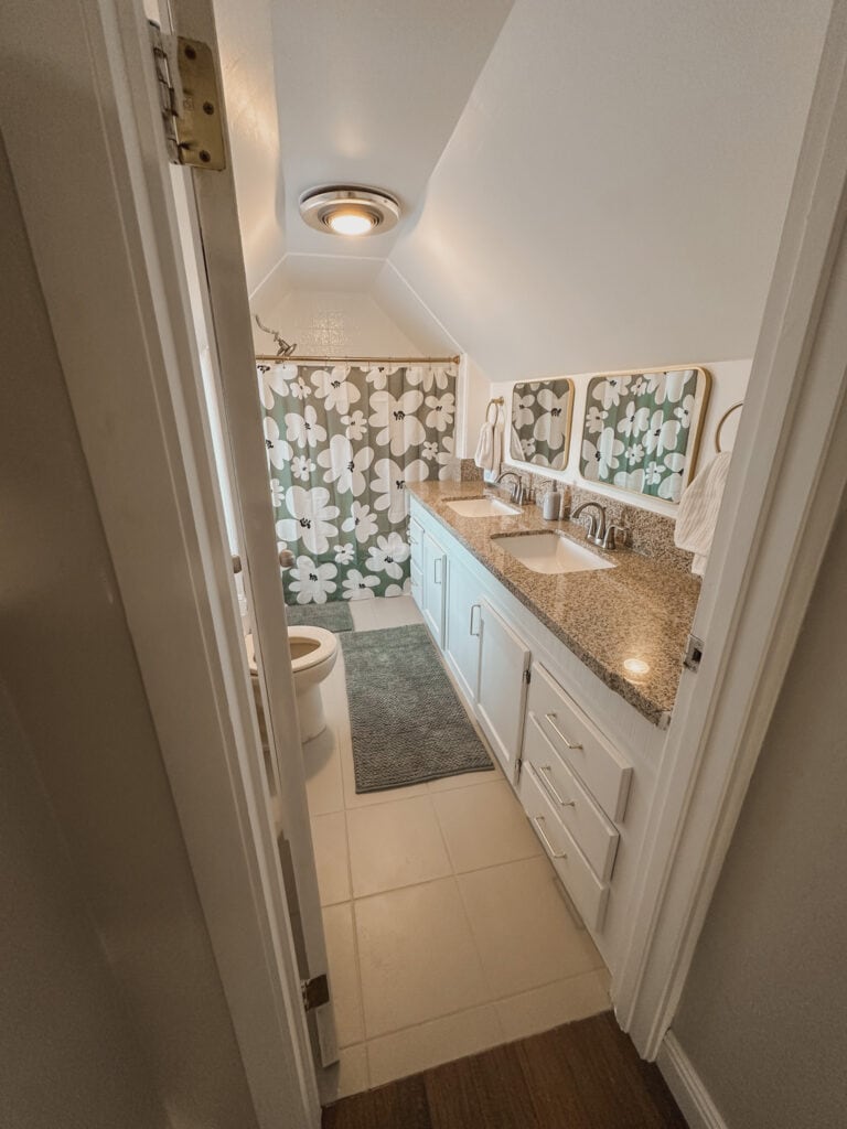 Back to the bathroom! While we are very glad that some previous owners of the home added a functioning bathroom upstairs, it was unfortunately very poorly designed and haphazardly done. Because it is an attic bathroom, the ceiling is only about 6’4″ and there is a significant slant of the ceiling on both sides. This leaves a very small space for mirrors to be hung. You can really only see yourself in the mirror if you are under 5 feet tall.