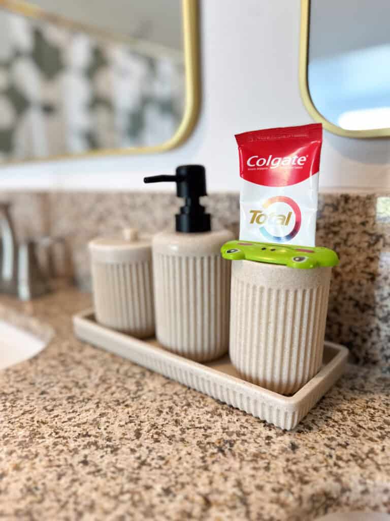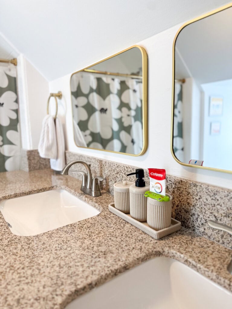 For the finishing touches, I added these bath mats that complement the shower curtain and have a great non-slip backing. I found this cute soap dispenser and toothbrush holder set. I also add a simple organizer in the drawers for hair ties and brushes. The final touch was this little frog that helps dispense toothpaste without having to squeeze the tube. The frog is definitely one of the kid’s favorite parts of this makeover.