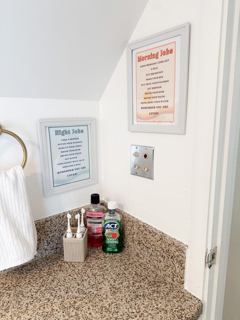 The art prints on the walls are from Esty and I made the word art and chore charts myself on Canva.