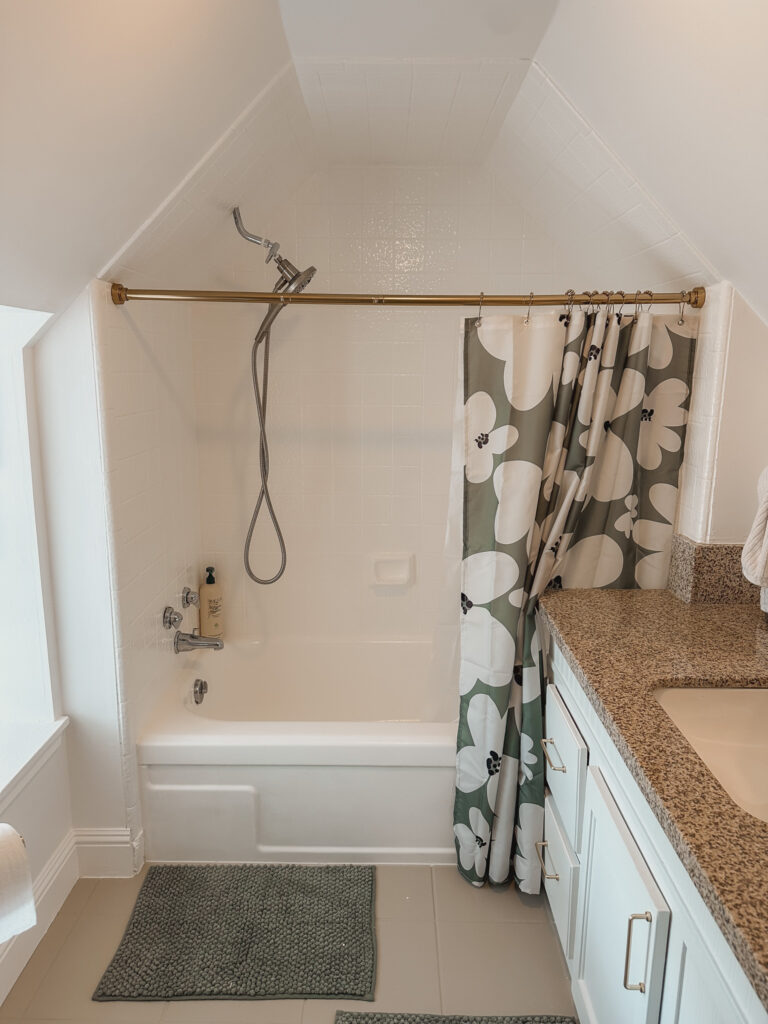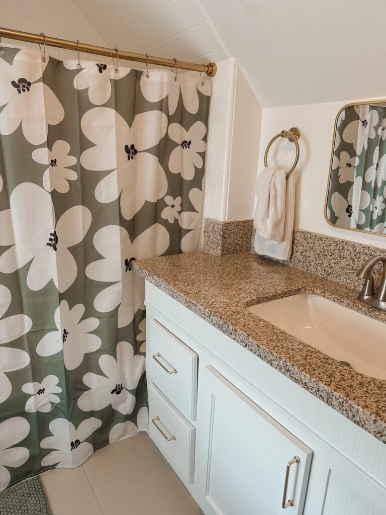 I love this shower curtain! I am admittedly not a huge fan of ultra-colorful kid decor and tend to prefer earth tones. This shower curtain was the best of both worlds! A gorgeous earthy green, my favorite color, with big bright whimsical flowers. Even though I got it in the shortest possible length and width and still had to cut about a foot off the bottom to fit this tiny shower. I hemmed the bottom using this mini sewing machine that I purchased to teach myself how to sew. The shower curtain rod is gorgeous and I was able to adjust it to fit this tiny shower by taking out one of the sections.