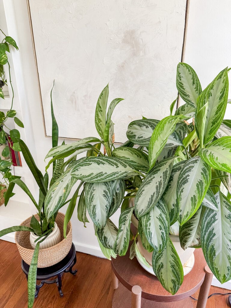 When it comes to care, the Chinese Evergreen falls on the moderate side of the spectrum. These plants thrive in bright, indirect light and prefer consistently moist, well-draining soil. They’re also relatively forgiving, making them a great choice for both seasoned plant parents and those new to houseplants. I find they need quite a bit more water than most of my other plants. Particularly when they are flowering. I water mine well every week, but regularly water it throughout the week with water cups left out.