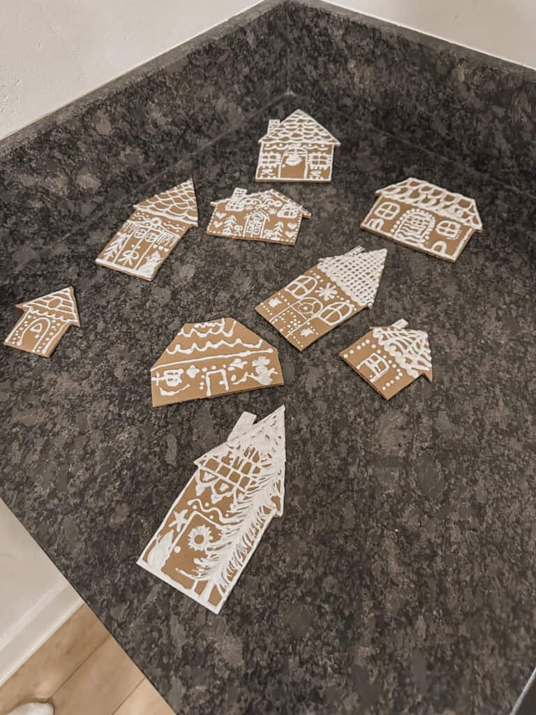 Squeeze the puffy paint directly over the pencil lines, outlining doors, windows, and every decorative detail. The raised effect is what makes the cardboard houses look like real gingerbread cookies.