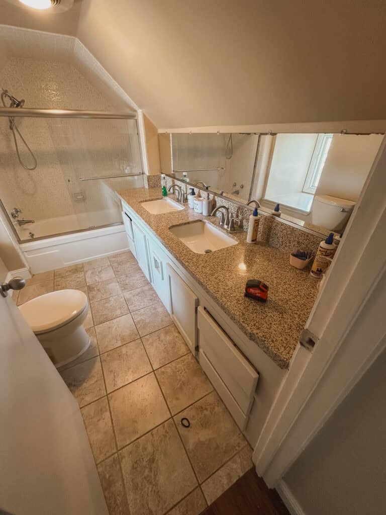 The tile in this bathroom wasn’t actually that bad. If I weren’t chasing my vision of a clean, modern, minimal, bright, and colorful kids’ bathroom, I might have kept it. Travertine tile can work in a modern space — it’s just not the vibe I was going for.