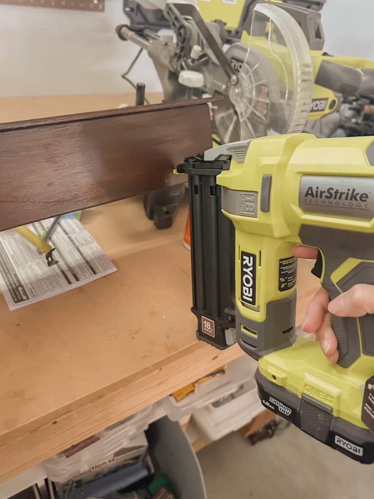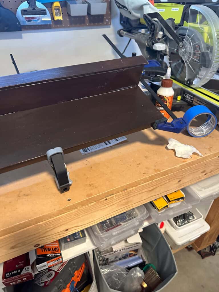 Once dry, glue and clamp the 1×4 top to the 1×6 backboard at a 90° angle. Let it cure for at least an hour (overnight is even better). If you have one, use a nail gun for added strength. You can also just use regular finishing nails and a hammer.