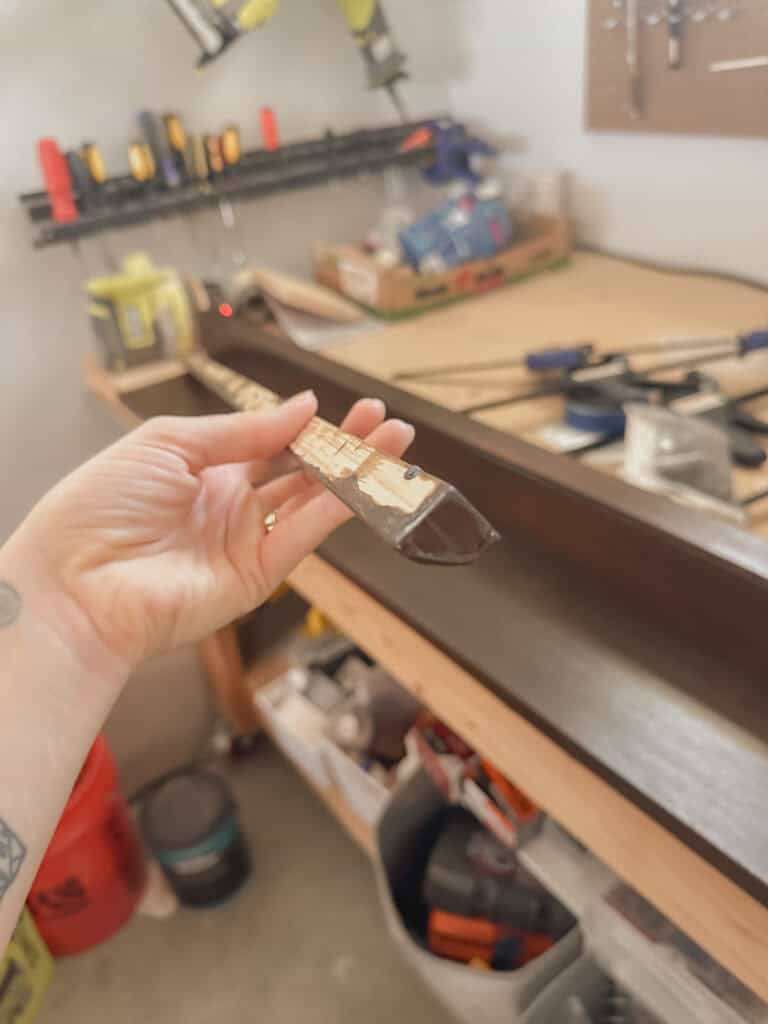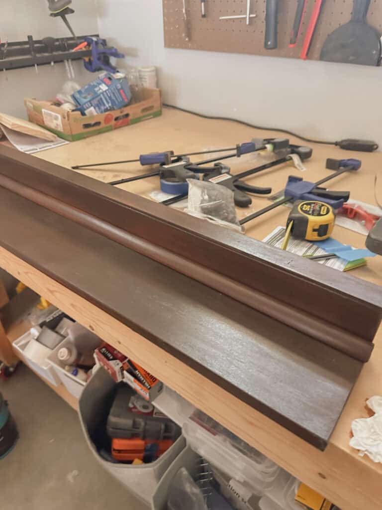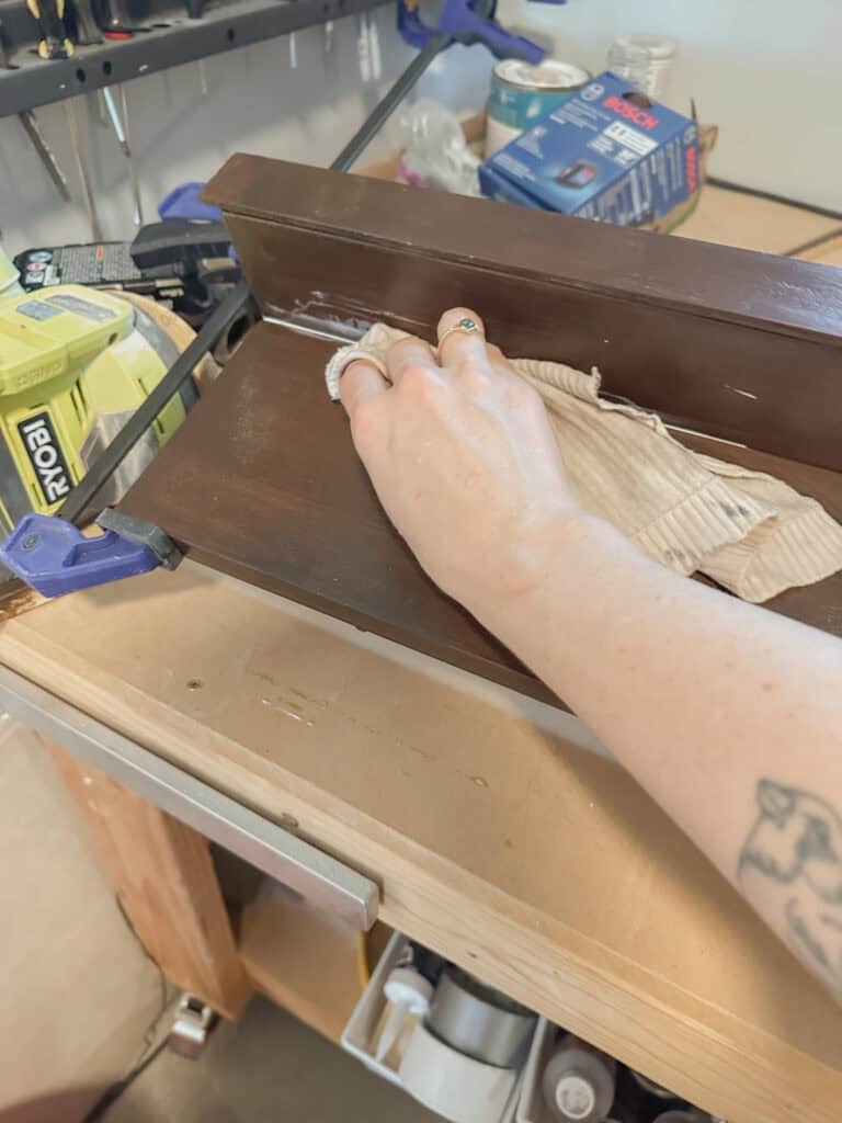 Apply your chosen wood stain (I used a walnut Varathane stain and polyurethane combo). Multiple coats will darken the color — I did three for a rich, warm tone.