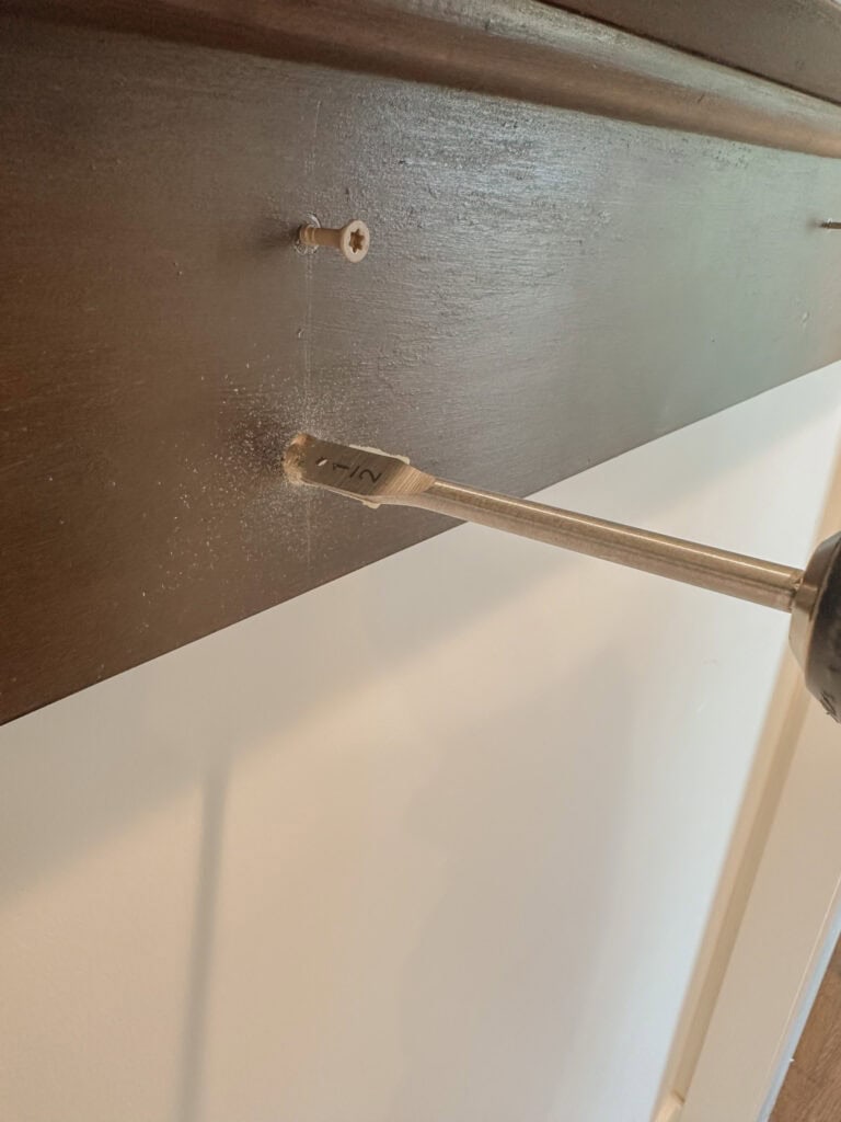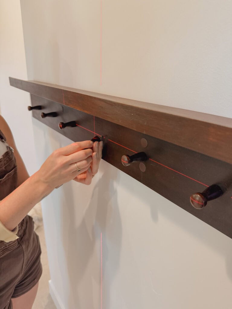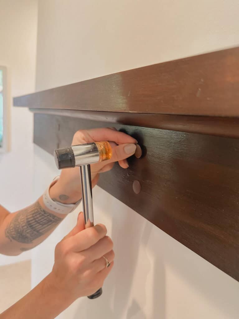 Because my shelf was about 4 feet long and only 2 studs were available in that wall section, we used six wood screws to secure the shelf to the studs and added matching screw caps for a cute finishing touch that helped hide the screws completely.