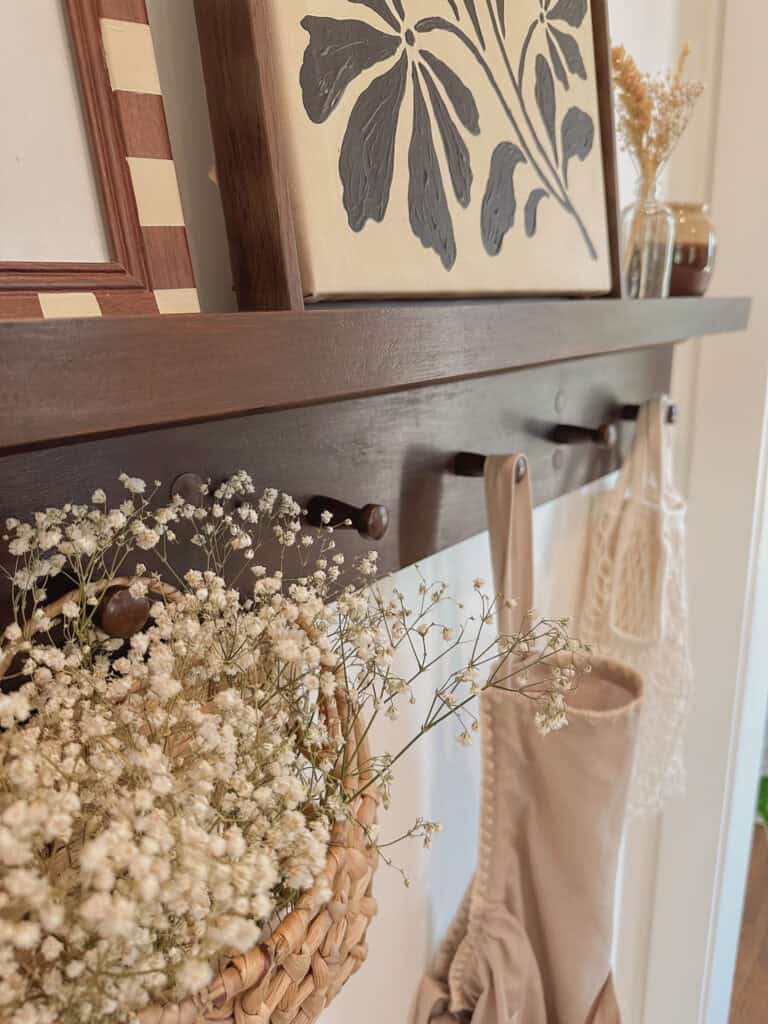 It’s also where I hang my sun hat and reusable shopping bags. Beyond being functional, it completely transformed a blank wall — adding depth, warmth, and charm.