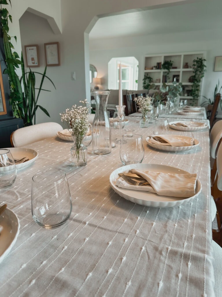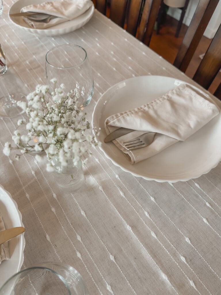 For the tablecloths, I actually used curtains I already had (also thrifted) — no one could tell, and they added the perfect soft texture to the setup. The simple cream cloth napkins were a buy from last year, and they ended up working beautifully with everything else.