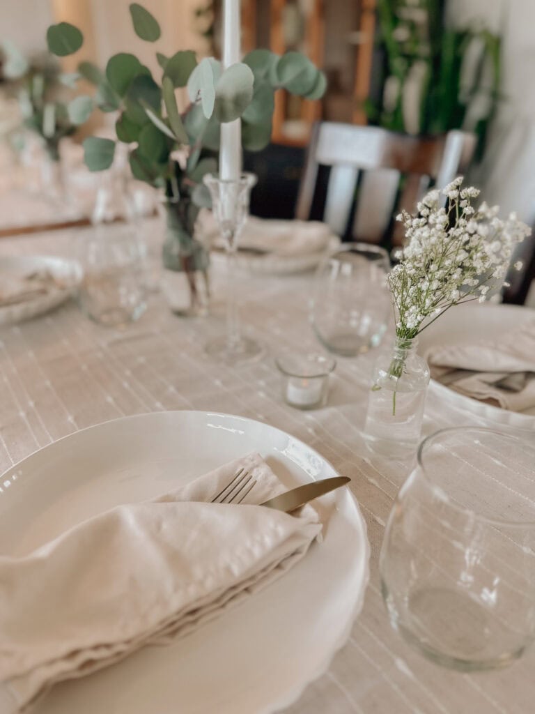 I’m a big believer that you don’t have to spend a lot to create something special. I thrifted almost every piece of decor for this dinner party: the candle holders, candles, glassware, and vases. Each item was unique, adding so much character to the table.